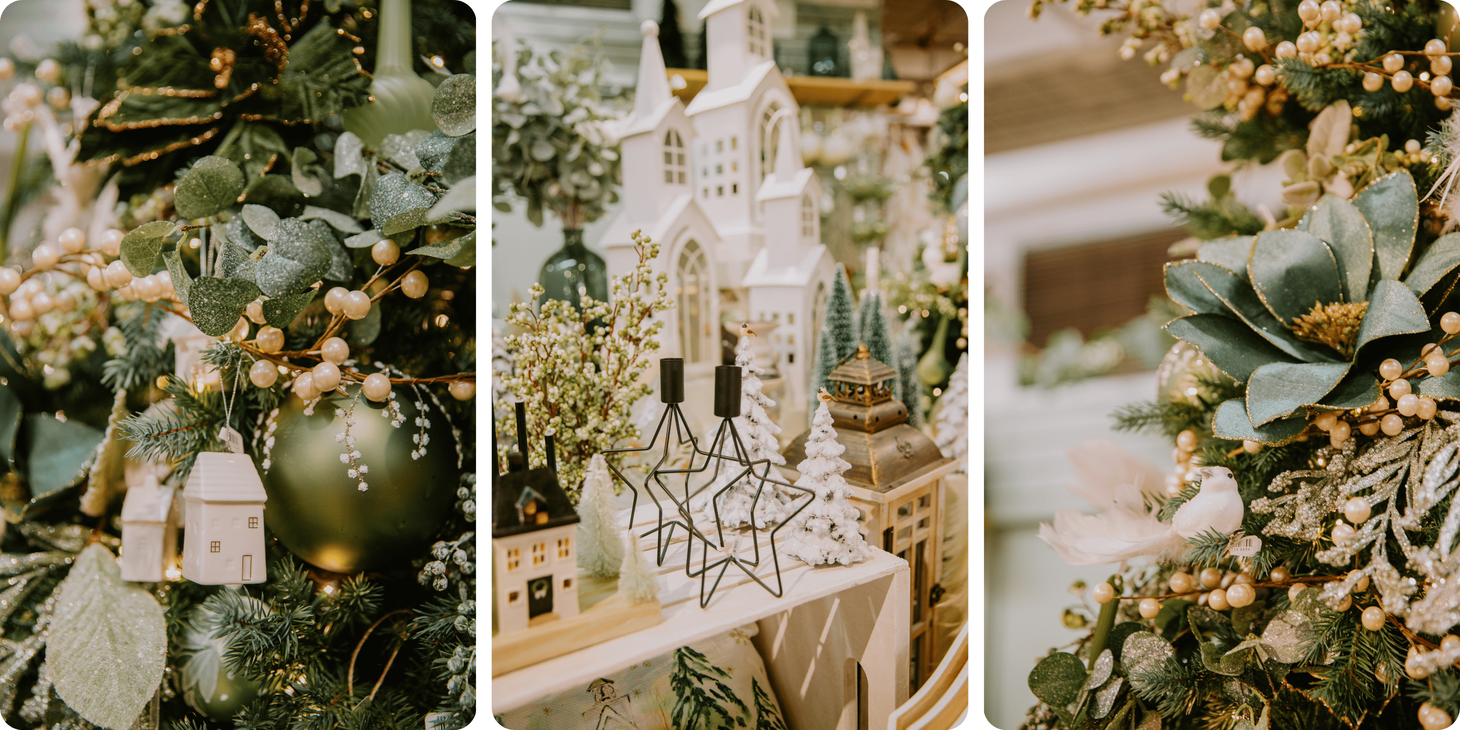 The Sage Pines Christmas theme is serene and beautiful, with soft accents in white and an abundance of greenery for a fresh, airy look that exudes tranquil elegance.