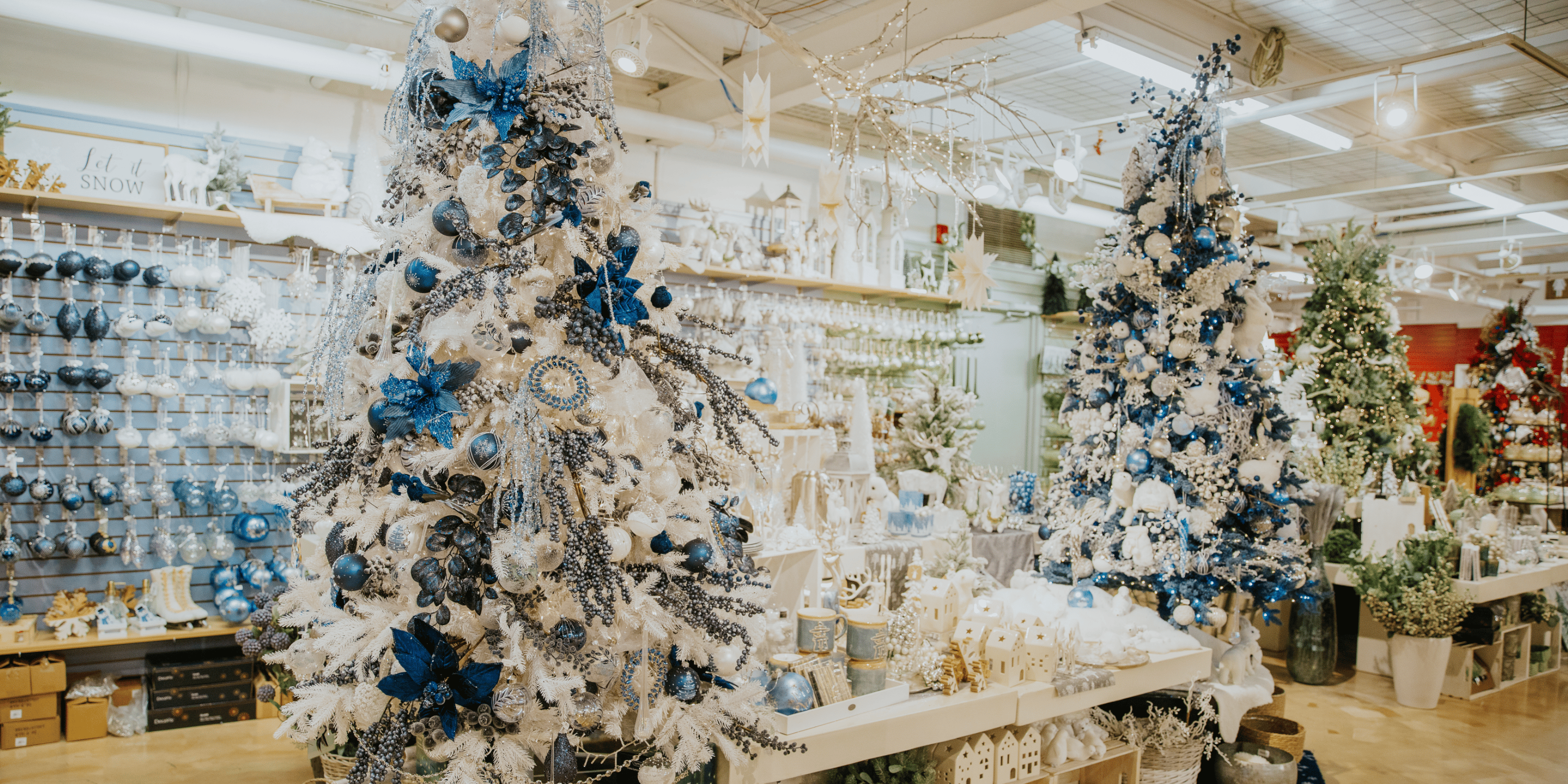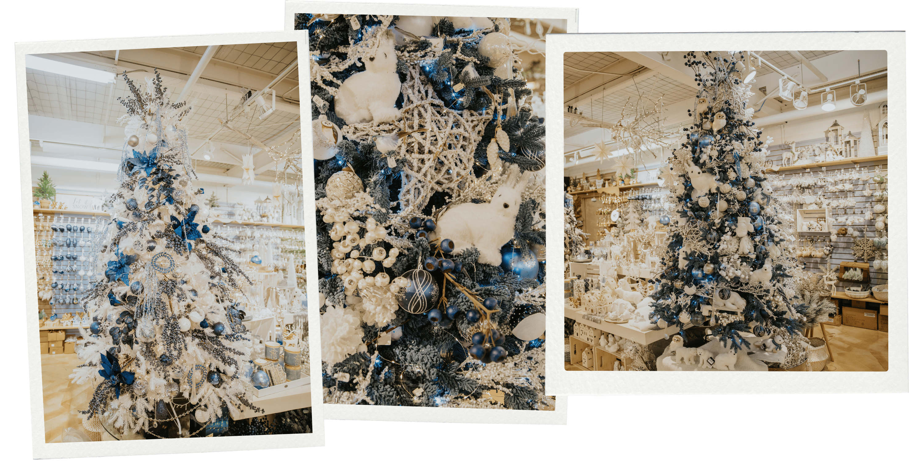 This wintery scene is brought to life with frozen stems of poinsettias, leaves, and berries, ornaments in frosty whites and blues, and icy crystal accents — all on beautiful white and blue flocked trees.